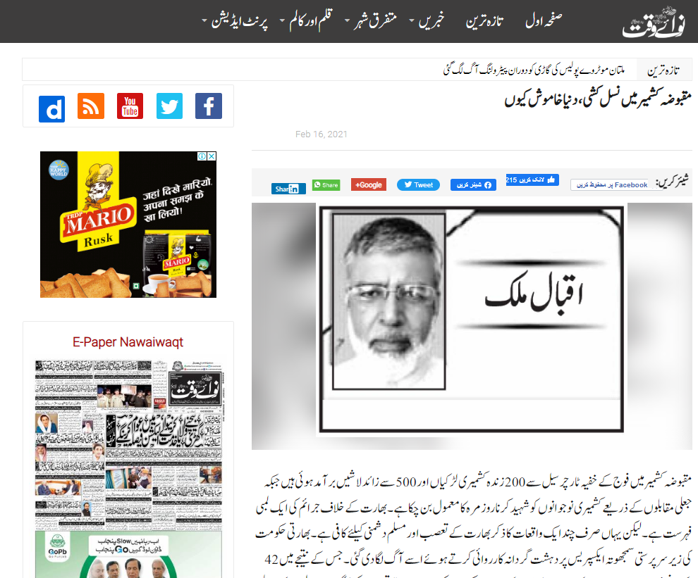 ہم نے یہی کیورڈ گوگل میں سرچ کیے جہاں ہمیں پاکستانی اخبار نوائے وقت کی وئب سایٹ پر 16 فروری 2021 میں شائع اس حوالے سے ایک رپورٹ ملی۔