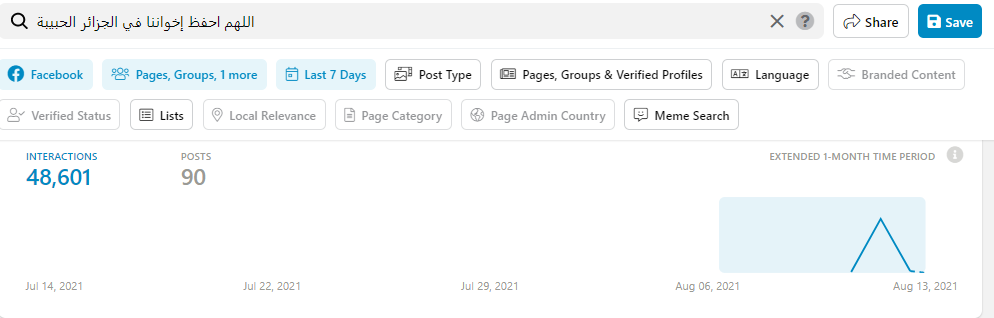 کراؤڈ ٹینگل پر جب ہم نے الجیریا آتشزدگی سے متعلق کی کیورڈ سرچ کیا تو ہمیں پتا چلا کہ اس موضوع پر پچھلے 7 دنوں میں 48,601 فیس بک صارفین تبادلہ خیال کر چکے ہیں۔ جس کا اسکرین شارٹ درج ذیل میں موجود ہے۔