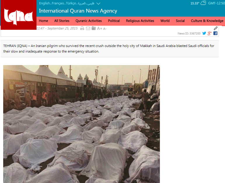 مذکورہ تصویر کے ساتھ شائع ملتی جلتی رپورٹ یہاں پڑھی جا سکتی ہے۔ جس میں لکھا ہے کہ مکہ کے قریب منیٰ میں بھگدڑ مچ گئی تھی، جس میں سعودی حکام نے مہلوکین کی تعداد 717 شمار کیا تھا۔ سعودی حکام کا کہنا تھا کہ مقدس شہر مکہ کے نزدیک بھگدڑ میں مزید 863 افراد زخمی ہوئے تھے، یہ حادثہ اس وقت پیش آیا جب 20 لاکھ عازمین حج آخری بڑی رسومات میں شرکت کر رہے تھے۔