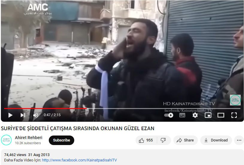 اذان دے رہے شخص کی حماسی جنگجوؤں سے منسوب کر کے شیئر کی گئی ویڈیو کو سب سے پہلے ہم نے کیفریم میں تقسیم کیا اور ایک فریم کو ین ڈیکس سرچ کیا۔ جہاں ہمیں ترکش کیپشن کے ساتھ 31 اگست 2013 کو اپلوڈ شدہ احرت رہبری نامی یوٹیوب چینل پر ہوبہو ویڈیو ملی۔ ترجمہ کرنے پر معلوم ہوا کہ یہ شام (سیریا) میں لڑائی کے دوران دی گئی خوبصورت اذان کی ویڈیو ہے۔