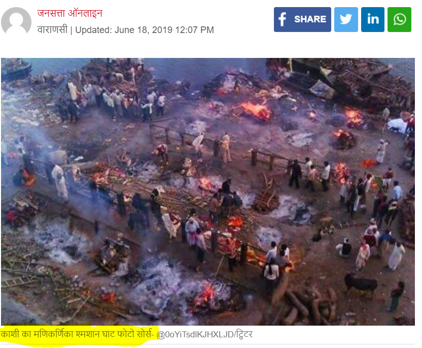 مذکورہ جانکاری سے پتاچلا کہ وائرل تصویر کم از کم ایک سال پرانی ہے اور وارانسی منی کرنیکا شمشان گھاٹ کی ہے۔ پھر ہم نے اس حوالے سے مزید کیورڈ سرچ کیا۔ جہاں ہمیں جن ستا نیوز پر 2019 کی وائرل تصویر کے ساتھ شائع خبر ملی۔ جس میں تصویر کو وارانسی کے کاشی کے منی کرنیکا شمشان گھاٹ کا بتایا گیا ہے۔ وہیں امر اجالا نیوز ویب سائٹ پر 26 ستمبر 2018 کی ایک خبر ملی۔ جس میں بھی وائرل تصویر کو کاشی منی کرنیکا گھاٹ کا بتایا گیا ہے۔