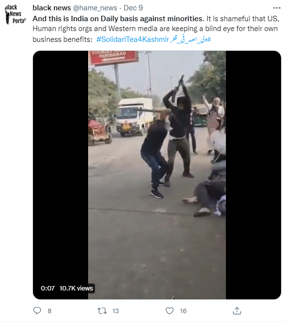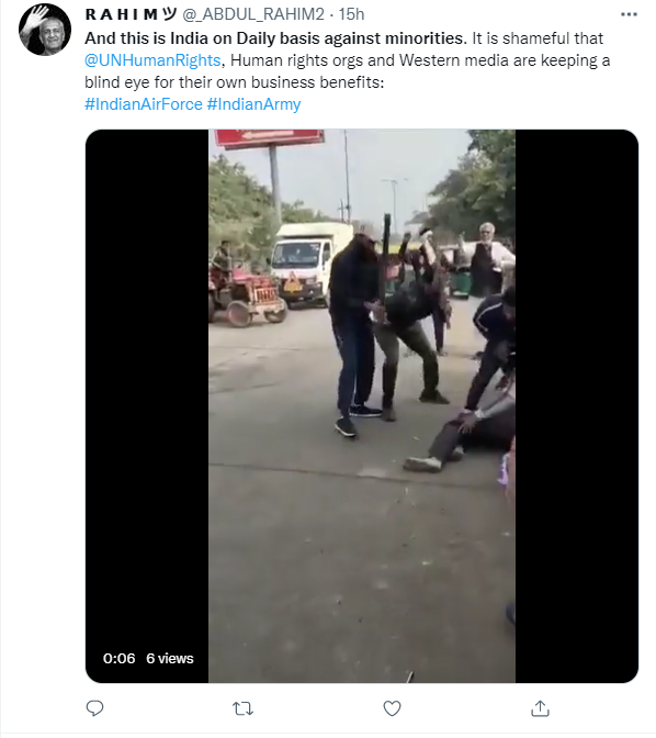 ٹویٹر پر 13 سیکینڈ کا ایک ویڈیو شیئر کیا جا رہا ہے۔ ویڈیو میں کچھ لوگ سر راہ ایک شخص کی لاٹھی اور ہتھوڑے سے پٹائی کرتے ہوئے نظر آرہے ہیں۔ اس ویڈیو کو صارف نے مذہبی رنگ دے کر شیئر کیا ہے۔ صارف نے کیپشن میں لکھا ہے کہ “جس کسی کو انڈین چیف بپن راوت کی فیملی سے ہمدردی ہے وہ اس ویڈیو کو غور سے دیکھ لیں، بھارت میں مسلمانوں کے ساتھ کیا سلوک کیا جا رہا ہے، بپن راوات نے اپنی فوج کو کشمیری خواتین کی عزتیں لوٹنے کا آرڈر دیا۔ جس حکومت یا اپوزیشن والے کو اس کی فیملی سے ہمدردی ہے ہمیں اس سے کوئی ہمدردی نہیں ہے”۔