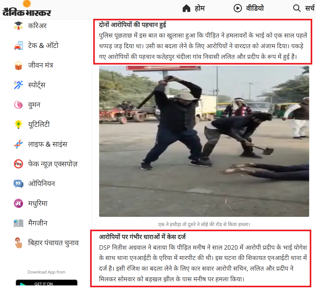 مزید سرچ کے دوران ہمیں وائرل ویڈیو کے حوالے سے ٹی وی9 بھارت اور دینک بھاسکر پر شائع خبریں ملیں۔ جس کے مطابق منیش پر حملہ کرنے والے دو ملزمین کو پولس نے گرفتار کر لیا ہے، ساتھ ہی قتل کی کوشش، ہوائی فائرنگ سمیت کئی دفعات کے تحت ایف آر بھی درج کی گئی ہے۔ دینک جاگرن کے مطابق منیش نے ایک سال پہلے ملزم پردیپ کے بھائی یوگیش کے ساتھ مار پیٹ کی تھی، اسی کا بدلہ لینے کے لئے تینوں ملزمین نے اس واردات کو انجام دیا ہے۔