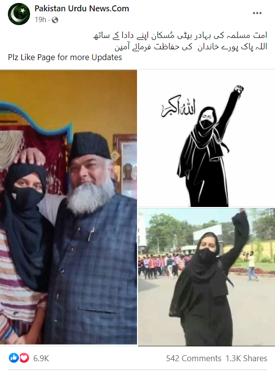 پاکستان اردو نیوز نامی پیج پر اس تصویر کو شیئر کرکے کیپشن میں لکھا ہے کہ “امت مسلمہ کی بہادر بیٹی مُسکان اپنے دادا کے ساتھ اللہ پاک پورے خاندان کی حفاظت فرمائے آمین”۔