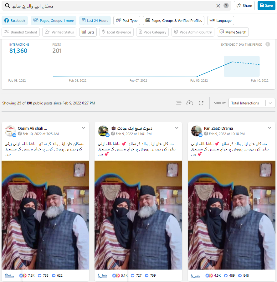 فیس بک اور ٹویٹر پر مذکورہ دعوے کے ساتھ شیئر کی گئی تصویر کو کتنے صارفین نے پوسٹ کیا ہے، یہ جاننے کے لئے ہم نے کراؤڈ ٹینگل پر کیورڈ سرچ کیا تو ہمیں پتا چلا کہ اس موضوع پر محض 24 گھنٹوں میں 201 پوسٹ شیئر کئے گئے ہیں اور 81,360 فیس بک صارفین نے اس موضوع پر تبادلہ خیال کیا ہے۔ جبکہ ٹویٹر پر بھی کئی صارفین نے اس ویڈیو کو شیئر کیا ہے۔