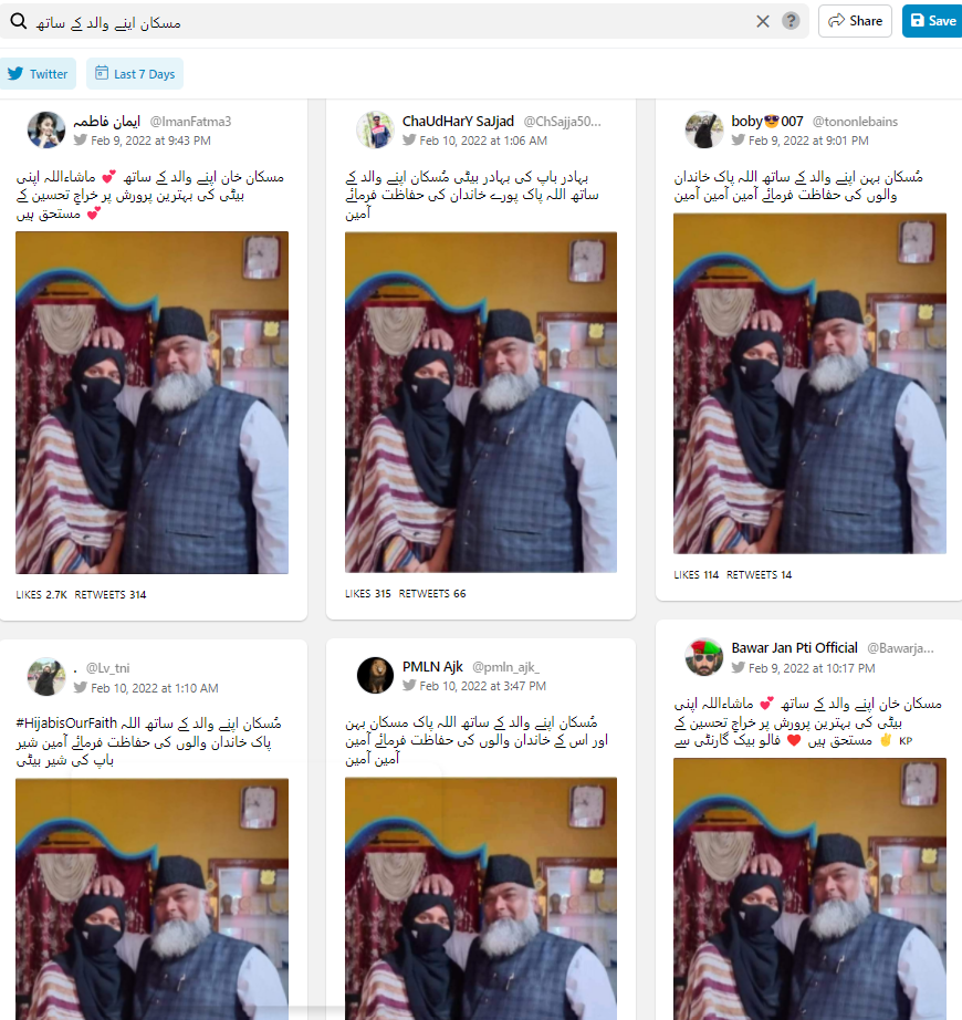 اس بیچ نعرے لگانے والی مسکان خان کی تصویر کے ساتھ ایک شخص کی تصویر بہت وائرل ہو رہی ہے۔ صارفین کا دعویٰ ہے کہ یہ تصویر کرناٹک کی شیرنی مسکان خان اپنے والد کے ساتھ کھڑی ہیں، کچھ صارفین اس شخص کو دادا کے ساتھ کھڑی مسکان کی تصویر بتاکر بھی شیئر کر رہے ہیں۔