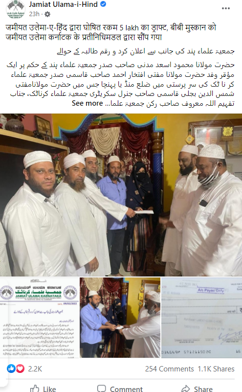 مذکورہ پوسٹ میں دی گئی جانکاری کے مطابق جمعیۃ علماء ہند کی جانب سے جو پانچ لاکھ روپے انعام دینے کا اعلان کیا گیا تھا، جسے دینے حضرت مولانا محمود اسعد مدنی صاحب صدر جمعیۃ علماء ہند کے حکم پر ایک مؤقر وفد اعلان کردہ پانچ لاکھ کی رقم بروز بدھ بتاریخ 2022 /02 / 09 کو بی کام سیکنڈ ائیر کی طالبہ بی بی مسکان خان بنت جناب حسین خان کو دی گئی تھی”۔ اب یہاں ہمیں ایک اشارہ ملا کہ نیلی شرٹ و کالی پینٹ میں جو شخص نظر آرہے ہیں وہی مسکان کے والد ہیں، جن کی شکل وائرل تصویر میں نظر آرہے شخص سے مختلف تھی۔