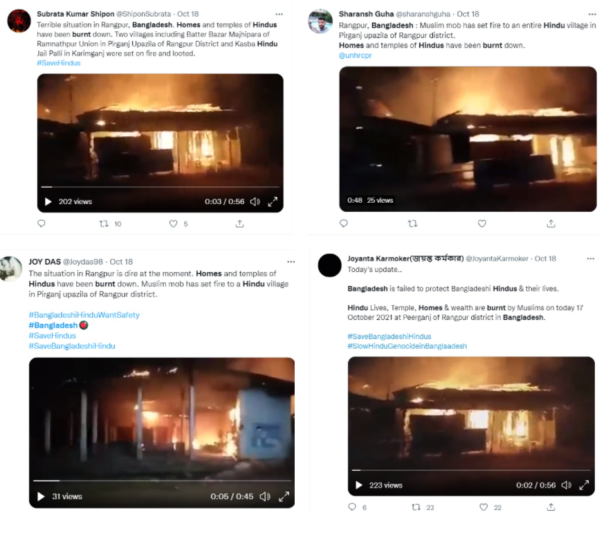 بنگلہ دیش کے رنگ پور میں 17 اکتوبر کو فساد کی خبر سامنے آئی تھی۔ جس کے بعد سوشل میڈیا پر جلتے ہوئے گھر کا ایک ویڈیو خوب شیئر کیا گیا۔ ویڈیو میں صاف طور پر دیکھا جا سکتا ہے کہ ایک پنڈال میں آگ لگی ہے، جس پر فائرمین قابو پانے کی کوشش کر رہے ہیں۔ اس ویڈیو کے ساتھ دعویٰ کیا جا رہا ہے کہ ان دنوں بنگلہ دیش کے رنگ پور میں حالات کشیدہ ہے، مسلمانوں کے ہجوم نے ہندؤں کے گھروں اور مندروں کو آگ کے حوالے کردیا ہے۔