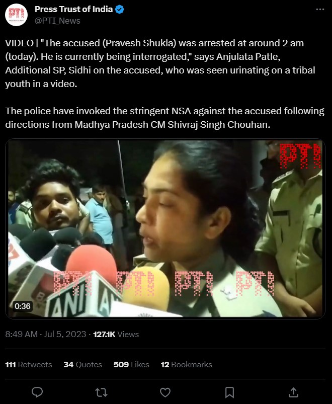 اس کے علاوہ ہمیں پریس ٹرسٹ آف انڈیا کے آفیشل ٹویٹر ہینڈل پر ایڈشنل ایس پی انجو لتا پاٹلے کا بیان بھی ملا۔ جس میں انہوں نے بتایا ہے کہ ملزم پرویش شکلا کو گرفتار کر لیا گیا ہے۔ مدھیہ پردیش کے وزیر اعلٰی شیوراج سنگھ چوہان کے حکم کی تعمیل کرتے ہوئے پرویش شکلا پر این ایس اے بھی لگایا گیا ہے۔