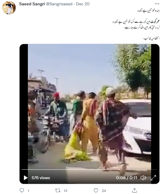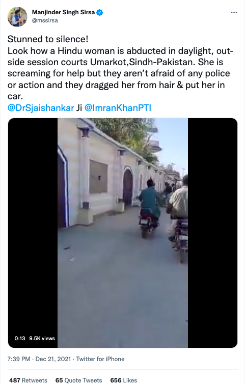 مذکورہ ویڈیو کو بھارتی جنتا پارٹی کے لیڈر منجیندر سنگھ سرسا نے بھی 21 دسمبر کو ٹویٹ کیا تھا۔ اس ویڈیو کے ساتھ سرسا نے لکھا تھا کہ “پاکستان کے سندھ کے عمرکوٹ میں ایک ہندو خاتون کو سرعام کورٹ کے باہر اغوا کر لیا گیا،منجیندر کے اس ٹویٹ کو ہمارے آرٹیکل لکھنے تک 400 سے زائد بار ری ٹیوٹ کیا جا چکا تھا”۔