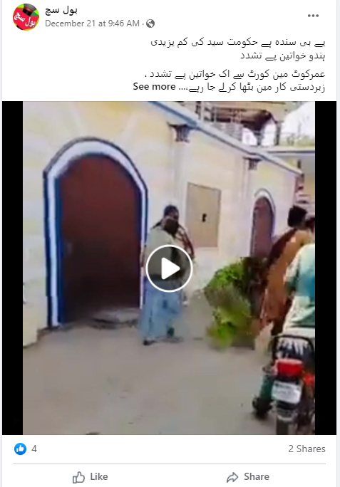 ہندو خاتون کو اغوا کرنے کے بعد قتل والے دعوے کے ساتھ شیئر کی گئی ویڈیو گمراہ کن ہے۔ گھریلو تشدد کے ویڈیو کو پاکستان میں ہندؤں پر ظلم سے جوڑ کر شیئر کیا گیا ہے۔ جس خاتون کو ویڈیو میں کچھ لوگ گھسیٹ رہے ہیں، وہ اپنے شوہر سے طلاق لینے کے لئے کورٹ پہنچی تھی۔ خاتون کو زبردستی لے جانے والے لوگوں میں اس کا شوہر بھی شامل تھا۔ یہ دونوں ایک ہی طبقے سے تعلق رکھتے ہیں۔