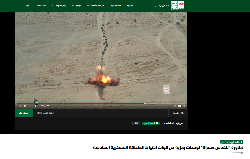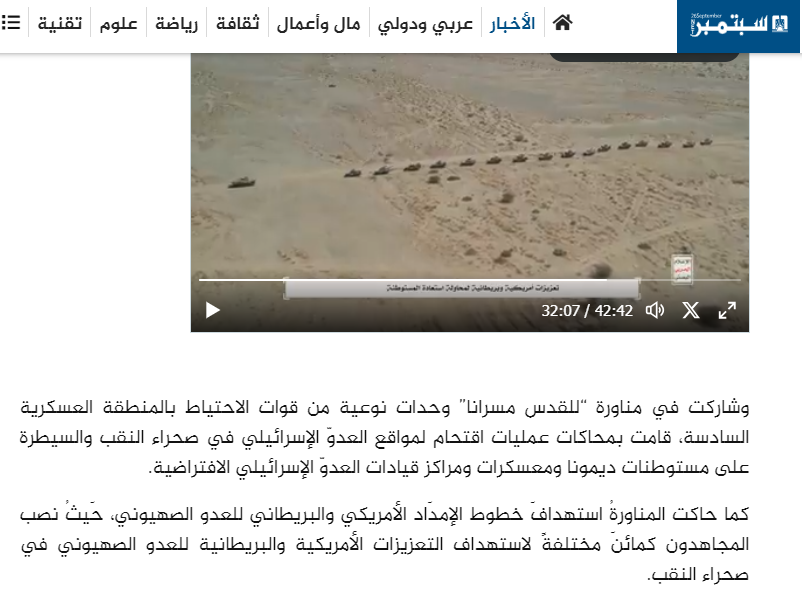اسرائیل کے فوجی قافلے پر حملے کا بتاکر شیئر کی گئی ویڈیو کے ایک فریم کو ہم نے کچھ کیورڈ کے ساتھ گوگل ریورس امیج سرچ کیا۔ جہاں ہمیں 12 مارچ 2024 کو شائع 26سبتمبر ڈاٹ نیٹ نامی ویب سائٹ پر 42 منٹ 42 سکینٹ پر مشتمل ویڈیو کے ساتھ شائع رپورٹ موصول ہوئی۔ جس کے 32 منٹ 7 سکینڈ پر ہوبہو مناظر دیکھے جا سکے ہیں۔ اس رپورٹ میں ویڈیو کو یمنی فوجی مشق کا بتایا گیا ہے۔ جس میں “القدس مسرانا” کے انداز میں صحرائے نیگیو میں اسرائیلی اڈوں، کیمپ اور ٹینکوں پر گھات لگاکر حملے کرنے کو دکھایا گیا ہے۔
