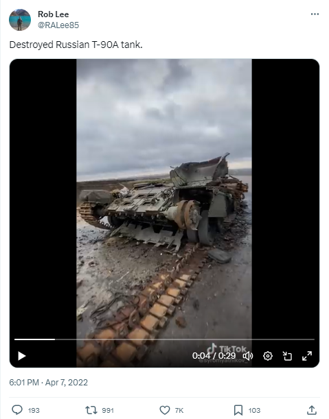 تباہ شدہ اسرائیلی میرکافا ٹینک کا بتاکر شیئر کی گئی ویڈیو کے ایک فریم کو ہم نے گوگل ریورس امیج سرچ کیا۔ جہاں ہمیں 7 اپریل 2022 کو شیئر شدہ روب لی نامی ایکس ہینڈل پر وائرل ویڈیو ملی۔ جس میں اس ویڈیو کو روسی ٹینک ٹی-90 اے کی تباہی کا بتایا گیا ہے۔