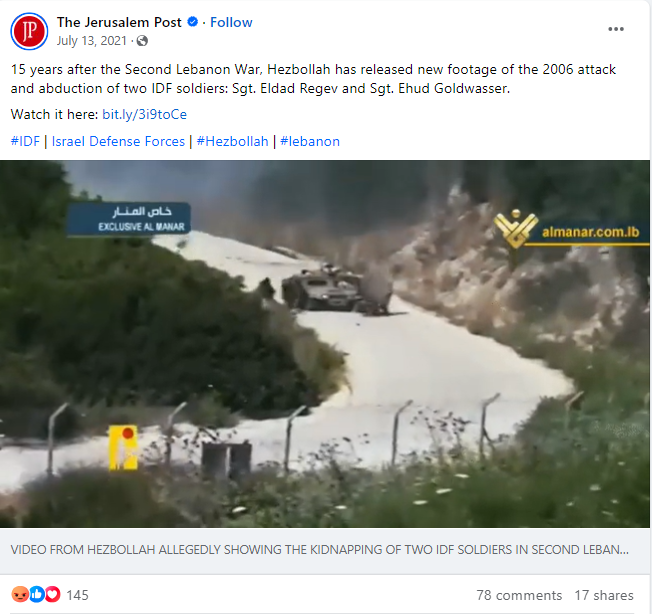 تازہ اسرائیل اور فلسطین تنازع سے جوڑکر شیئر کی گئی ویڈیو کے ایک فریم کو ہم نے گوگل ریورس امیج سرچ کیا۔ جہاں ہمیں دی یروشلم پوسٹ نامی فیس بک پیج پر 13 جولائی 2021 کو شیئر شدہ ہوبہو ویڈیو ملی۔ جس میں بتایا گیا ہے کہ دوسری لبنان جنگ کے 15 سال بعد حزب اللہ نے 2006 حملے اور دو آئی ڈی ایف فوجیوں کے اغوا کرنے کا یہ ویڈیو جاری کیا ہے۔