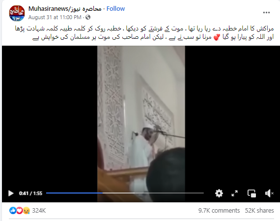 ایک فیس بک صارف نے ویڈیو کے کیپشن میں لکھا ہے کہ “مراکش کا امام خطبہ دے رہا رہا تھا، موت کے فرشتے کو دیکھا، خطبہ روک کر کلمہ طیبہ، کلمہ شہادت پڑھا اور اللہ کو پیارا ہو گیا۔ مرنا تو سب نے ہے، لیکن امام صاحب کی موت ہر مسلمان کی خواہش ہے”۔