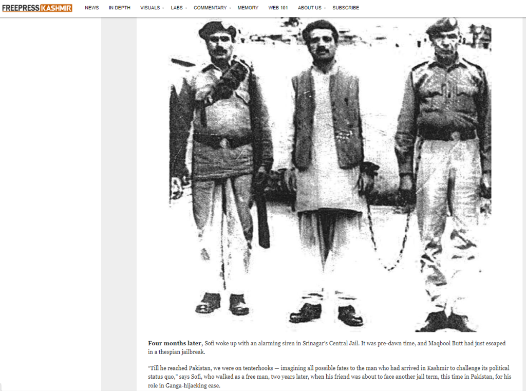 عمران خان کے والد کا بتاکر شیئر کی گئی تصویر کو ہم نے ریورس امیج سرچ کیا۔ جہاں ہمیں 11 فروری 2019 کو شائع شدہ فری پریس کشمیر نیوز ویب سائٹ پر مذکورہ تصویر ملی۔ رپورٹ کے مطابق ہاتھوں میں ہتھکڑی لگے شخص کی یہ تصویر کشمیری علیحدگی پسند لیڈر مقبول بھٹ کی ہے۔