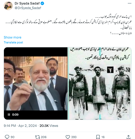 ایک ایکس صارف نے تصویر کے ساتھ کیپشن میں لکھا ہے “عمران خان کے باپ اکرام اللہ نیازی کرپشن کرتے ہوئے رنگے ہاتھوں پکڑے گئے۔ جسکو بے عزتی کے ساتھ نوکری سے نکالا گیا۔ بابا شیطانی”۔