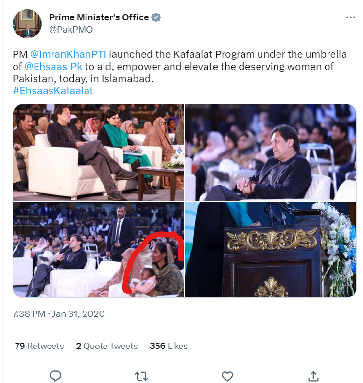 سب سے پہلے ہم نے عمران خان کے بغل میں بیٹھی خاتون کی تصویر کو گوگل ریورس امیج سرچ کیا۔ جہاں ہمیں پاک پی ایم او کے آفیشل ٹویٹر ہینڈل پر 31 جنوری 2020 کو شیئر شدہ ایک پوسٹ ملا۔ جس میں پی ٹی آئی رہنما عمران خان اور خاتون کی دوسرے اینگل سے لی گئی تصاویر ملیں۔ تصاویر کے ساتھ دی گئی معلومات کے مطابق پاکستان میں عمران خان کے دور حکومت کے دوران احساس پی کے اسکیم کے تحت کفالت پروگرام کا افتتاح کیا گیا تھا، جس کا مقصد مستحق خواتین کو امداد فراہم کرنا اور انہیں مضبوط بنانا تھا۔ وائرل تصویر اسلام آباد میں منعقد ہونے والے اسی وگرام کا حصہ ہے۔