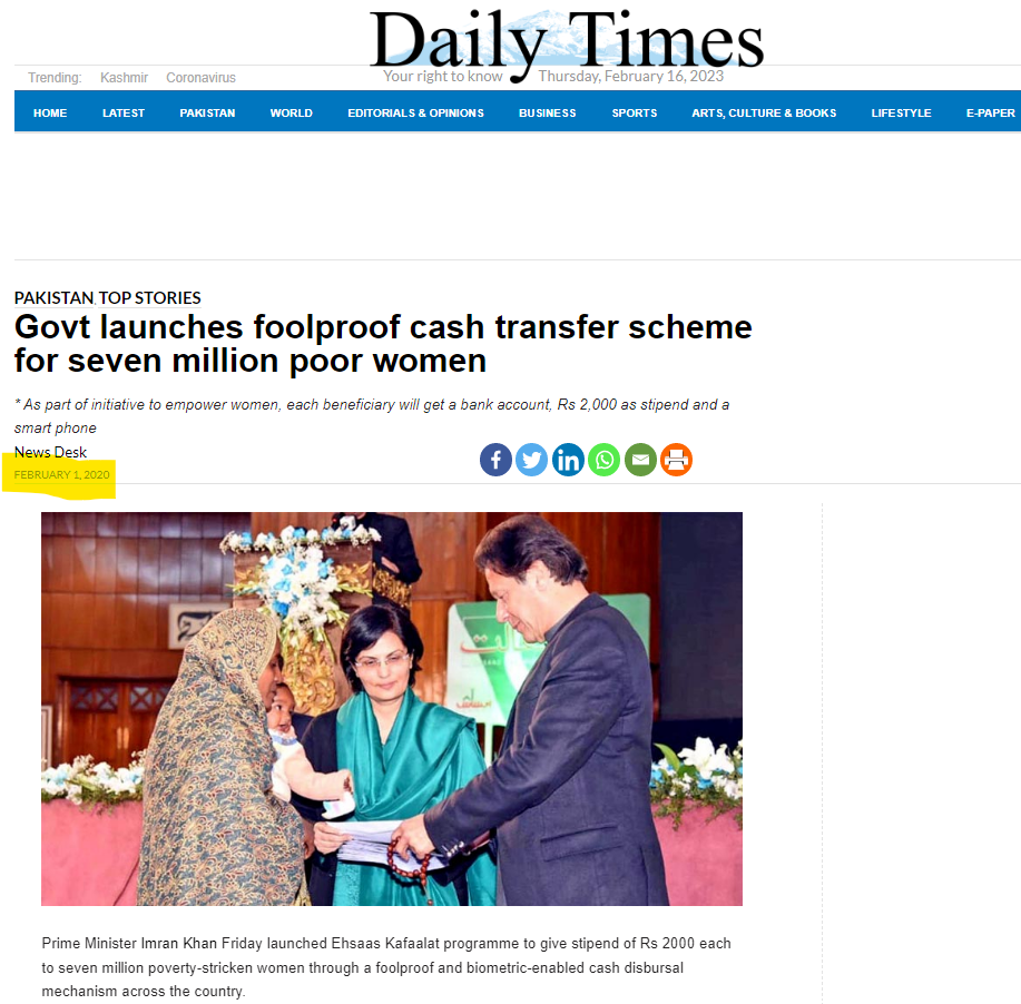 کیورڈ سرچ کے دوران ہمیں 31 جنوری 2020 کو اپلوڈ شدہ پاکستانی نیوز ویب سائٹ 24نیوز ایچ ڈی کے آفیشل یوٹیوب چینل پر احساس پروگرام کی براہ راست ویڈیو رپورٹ ملی۔ جس کے ایک منٹ 22 سکینڈ پر وائرل تصویر میں نظر آنے والی خاتون کو دیکھا جاسکتا ہے۔ اس کے علاوہ احساس کفالت پروگرام سے متعلق ڈان نیوز اور ڈیلی ٹائم نے بھی خبریں شائع کی ہیں۔
