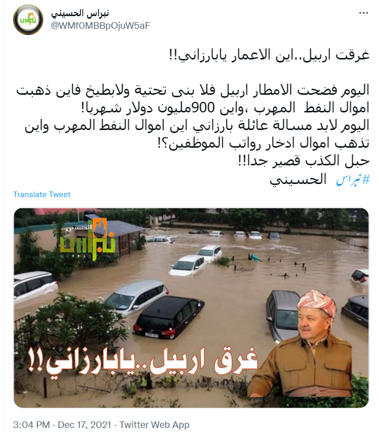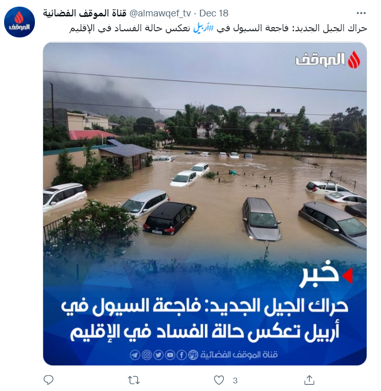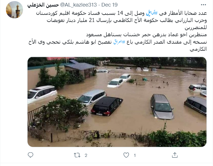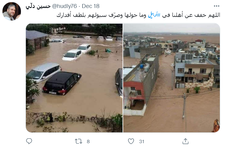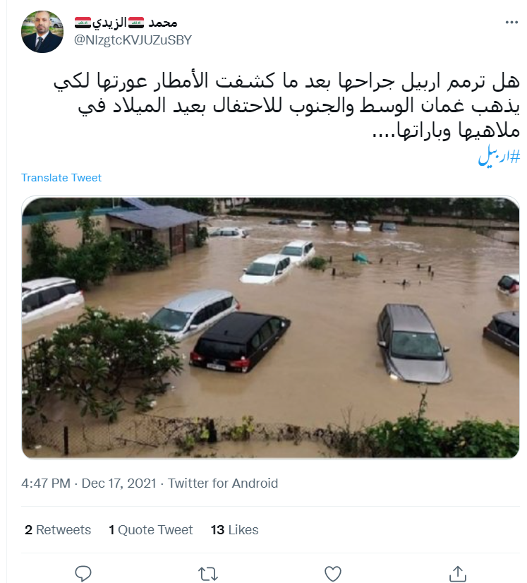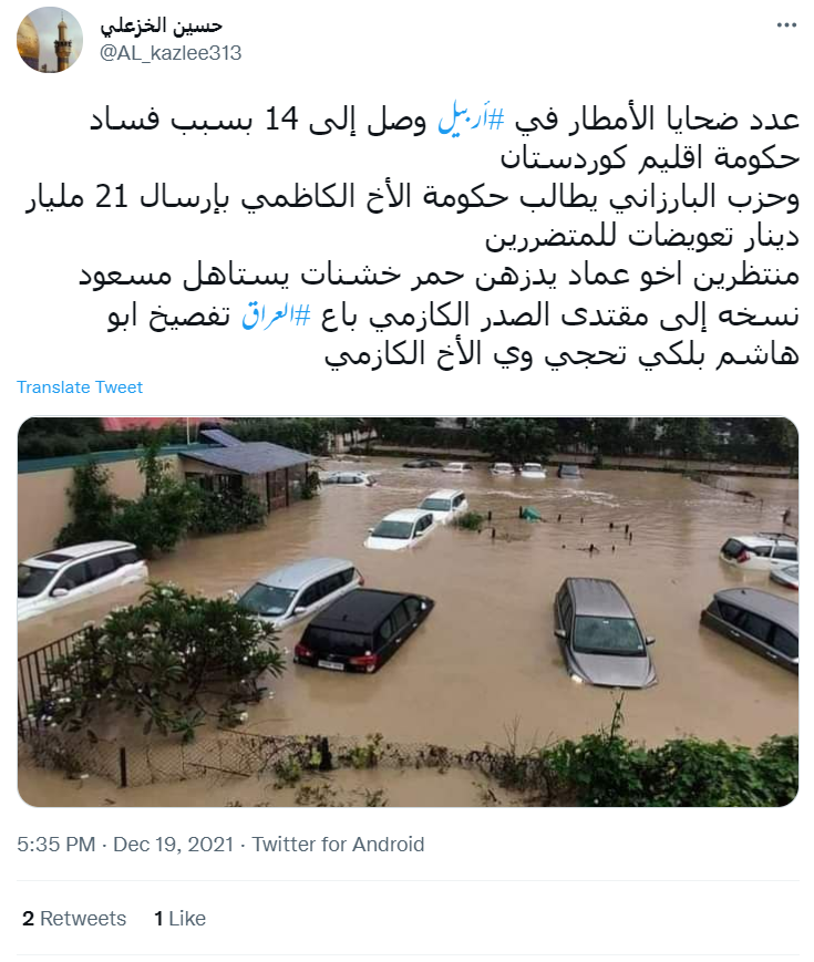 سعودی گزٹ پر شائع 18دسمبر 2021 کی ایک خبر کے مطابق شمالی عراق کے نیم خودمختار کردستان علاقے کی راجدھانی اربیل میں رواں سال کے 17 دسمبر کو شدید بارش کے سبب جانی و مالی نقصان ہوا تھا۔ تیز بارش کی وجہ سے 12 افراد کی اموات ہو گئی، جبکہ متعدد افراد زخمی ہوئے ہیں۔ کئی بچے اور خواتین کی گمشدگی کی بھی بات کہی گئی ہے۔ اسی کے پیش نظر اب پانی میں تیر رہی کاروں کی ایک تصویر اربیل کا بتاکر شیئر کی جا رہی ہے۔ ایک صارف نے عربی کیپشن میں لکھا ہے کہ “أمطار أربيل ليلة أمس شمال العراق”جس کا اردو ترجمہ ‘شمالی عراق کے اربیل میں گزشتہ رات تیز بارش کا منظر’ ہے۔