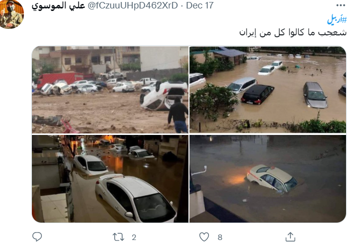 ٹویٹر پر پانی میں تیر رہی کاروں کی ایک تصویر شمالی عراق کے اربیل کا بتاکر شیئر کی جا رہی ہے۔ صارف نے تصویر کے کیپشن میں عربی زبان میں لکھا ہے کہ شمالی عراق کے اربیل میں تیز بارش کے سبب گاڑیاں ڈوب گئیں۔