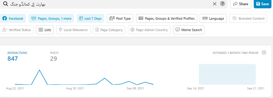 کراؤڈ ٹینگل پر جب ہم نے “بھارت کے کمانڈو جنگ” سرچ کیا تو ہمیں پتا چلا کہ اس موضوع پر محض پچھلے 7 دنوں میں 847 فیس بک صارفین تبادلہ خیال کر چکے ہیں۔