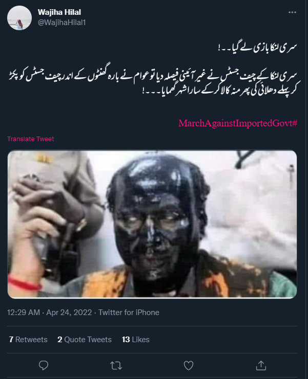 ٹویٹر پر ایک صارف نے مذکورہ وائرل تصویر کے ساتھ لکھا ہے کہ “سری لنکا بازی لے گیا۔۔! سری لنکا کے چیف جسٹس نے غیر آئینی فیصلہ دیا تو عوام نے بارہ گھنٹوں کے اندر چیف جسٹس کو پکڑ کر پہلے دھلائی کی پھر چہرہ کالا کرکے سارا شہر گھمایا۔۔۔!”۔