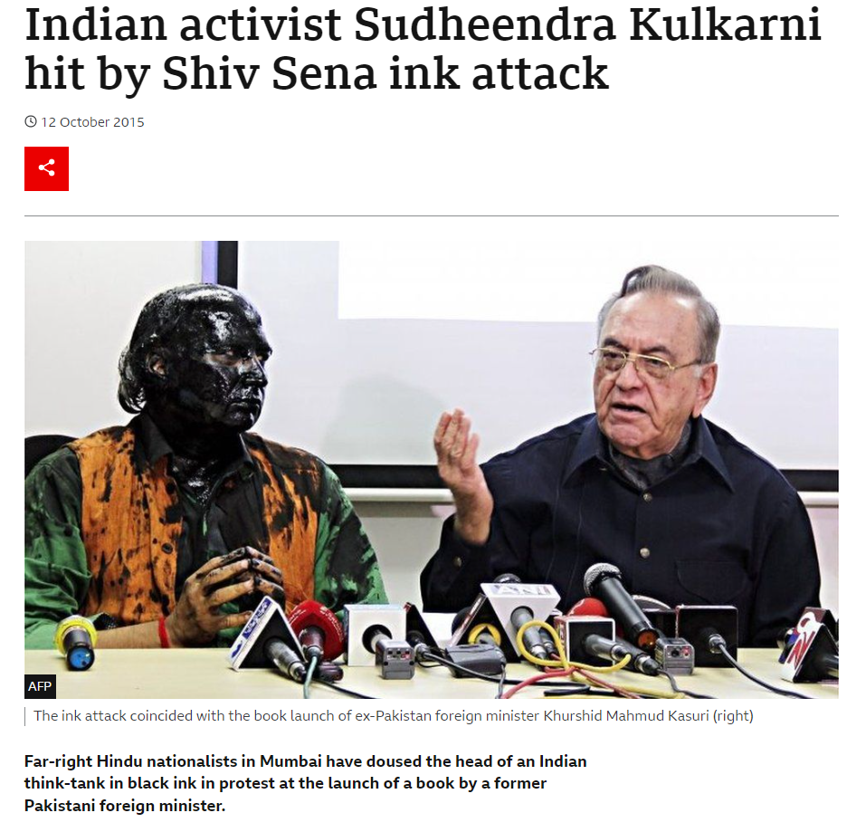 اس کے علاوہ ہمیں بی بی سی ڈاٹ کام پر بھی وائرل تصویر کے حوالے سے خبر ملی۔ اس رپورٹ کے مطابق سودھیندر کلکرنی ایک سماجی کارکن ہیں جن پر سیو سینا کرکنان نے سیاہی حملہ کیا تھا۔ یہ حملہ ان پر اس لئے کیا گیا کیونکہ وہ پاکستان کے سابق وزیر خارجہ خورشید محمود کسوری کی کتاب کی رونمائی میں شرکت کر رہے تھے۔ انہوں نے رپورٹرس کو بتایا کہ” 10-15 شیو سینک کے ایک گروپ نے ان کی کار روک لی، ان سے باہر آنے کو کہا، پھر انہیں پکڑ لیا، گالیاں دینی شروع کر دیں اور کہا ہم نے کہا تھا کہ اس کتاب کا اجرا روک دو پر تم نے بات نہیں سنی اب ہم تمہارے ساتھ یہی کریں گے”۔ حالانکہ اس حملے کے بعد بھی انہوں نے چہرے پر لگی سیاہی کے ساتھ ہی اس پروگرام میں شرکت کی۔