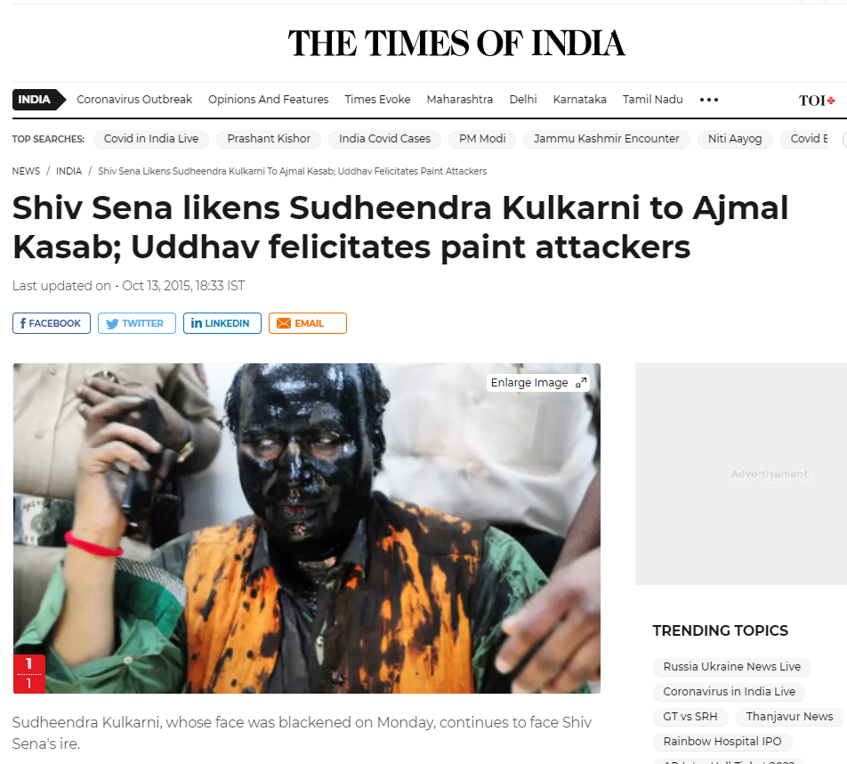 سری لنکا کے چیف جسٹس کا بتا کر شیئر کی گئی تصویر کو سب سے پہلے ہم نے ریورس امیج سرچ کیا۔ اس دوران ہمیں اسکرین پر2015 کی متعد خبریں ملیں۔ جس میں چہرے پر سیاہی لگے شخص کو بھارت کے سماجی کارکن سودھیندر کلکرنی کے طور پر متعارف کروایا گیا ہے۔ “سودھیندر کلکرنی اینک اٹیک” کیورڈ سرچ کیا تو ہمیں ٹائمس آف انڈیا اور این ڈی ٹی وی پر شائع 13 اکتوبر 2015 کی رپورٹس ملیں۔ ان رپورٹس میں بھی چہرے پر سیاہی لگے شخص کا نام سودھیندر کلکرنی بتایا گیا ہے۔