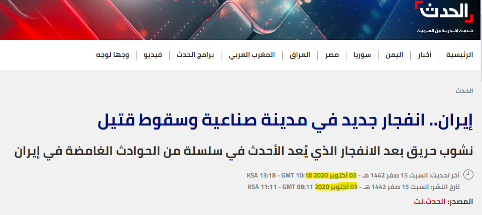 سب سے پہلے ہم نے وائرل تصویر کو ریورس امیج سرچ کیا۔ جہاں ہمیں 3 اکتوبر 2020 کو ریاض سے شائع ہونے والی الحدث نیوز ویب سائٹ پر ہوبہو تصویر ملی۔الحدث نیوز ویب سائٹ کے عنوان میں لکھا ہے کہ “ایران کے صنعتی علاقے میں دھماکہ”۔ لیکن تصویر کہاں کی ہے، اس کا ذکر نہیں کیا گیا ہے۔