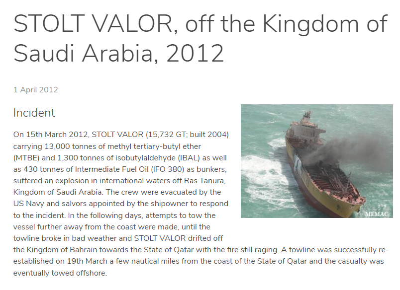 آئی ٹی او پی ایف نامی ویب سائٹ کے مطابق 15 مارچ 2012 کو اسٹالٹ وولر (15,732 جی ٹی؛ بلٹ 2004) 3000 ٹن میتھائل لے کر بحرین سے قطر جارہی بحری ٹینکر سعودی عرب کے شہر راس تنورہ کے قریب حادثے کا شکار ہوگئی تھی۔ جس میں موجود کارکنان کو امریکی بحریہ نے نکالا تھا۔ اس کے علاوہ وائرل تصویر سے متعلق معلومات ریوب نامی ویب سائٹ اور فائر فائٹنگ ڈاٹ ایم پی جی نامی یوٹیوب چینل پر بھی دی گئی ہے۔