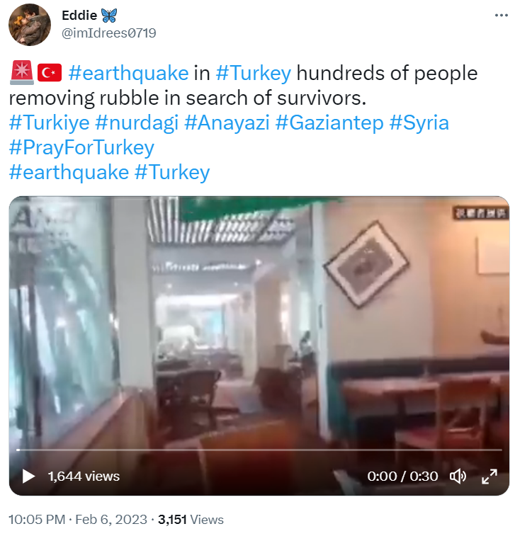 ایک ٹویٹر صارف نے مذکورہ ویڈیو کو انگلش کیپشن کے ساتھ شیئر کیا ہے اور اسے ترکی میں آئے حالیہ زلزلے کا بتایا ہے۔ ایک دوسرے ٹویٹر صارف نے بھی 6 فروری 2023 کو شیئر کیا تھا، لیکن جگہ کا نام نہیں لکھا ہے۔