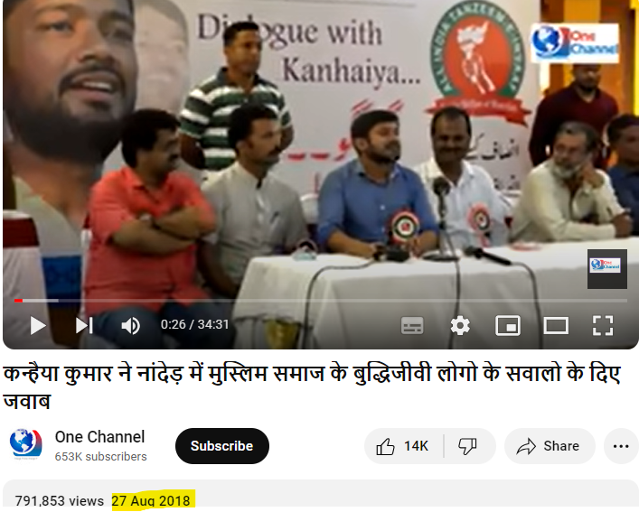 ہم نے سب سے پہلے ویڈیو کو غور سے دیکھا تو پیچھے لگے بینر پر اردو میں “انصاف، گفتگو” لکھا ہوا نظر آیا۔ پھر ہم نے ویڈیو کے ایک فریم کو گوگل ریورس امیج کے ساتھ انگلش میں “کنہیا کمار، انصاف، گفتگو” کیورڈ سرچ کیا۔ جہاں ہمیں کنہیا کمار کی ہوبہو ویڈیو ون چینل نامی یوٹیوب چینل پر 27 اگست 2018 کو اپلوڈ شدہ ملی۔ ہم نے پورے ویڈیو کو غور سے سنا، لیکن مذکورہ باتوں کا ذکر پوری ویڈیو میں کہیں بھی نہیں سنائی دیا۔