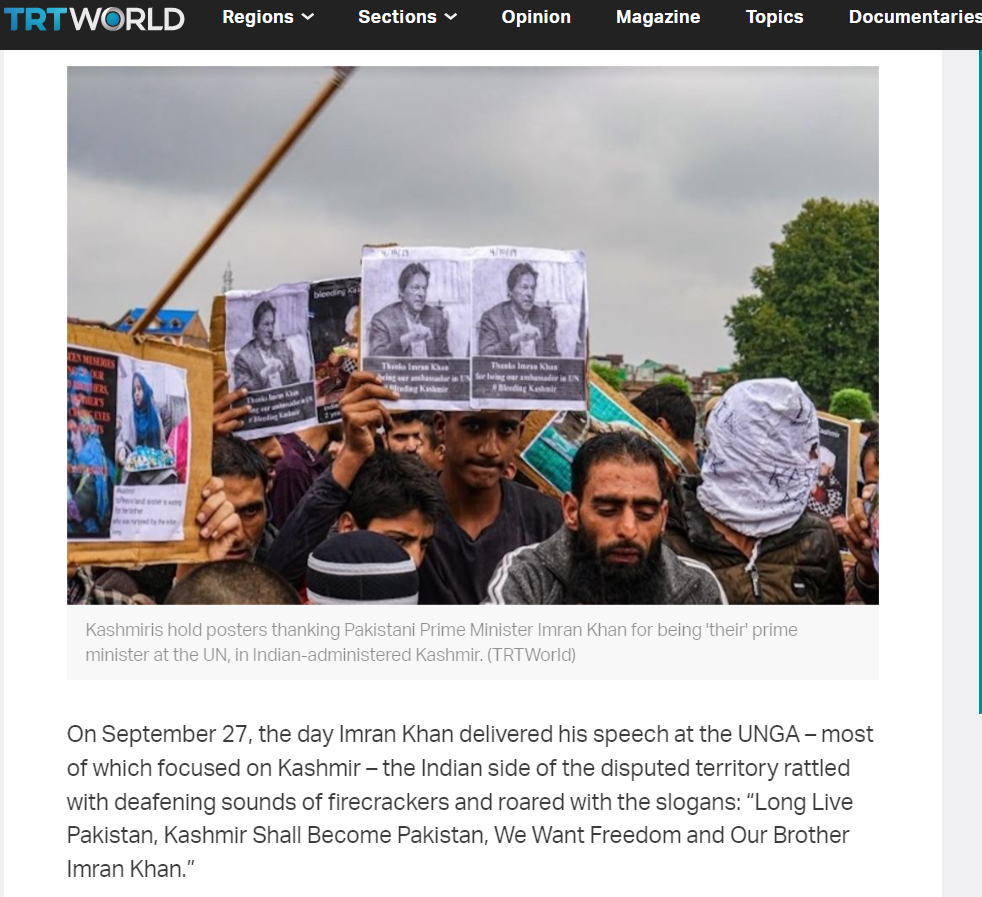 ٹی آر ٹی ورلڈ کی رپورٹ میں یہ لکھا ہے کہ 27 ستمبر 2019 کو جب پاکستان کے سابق وزیر اعظم عمران خان نے اقوام متحدہ کی جنرل اسمبلی میں خطاب کے دوران کشمیریوں کو توجہ کا مرکز بنایا، تو اس کے بعد کشمیر کا وہ علاقہ جو ہندوستان میں ہے وہاں کے لوگوں نے خوب جشن منایا ور ریلیاں بھی نکالیں۔