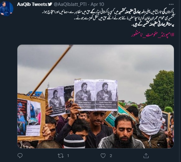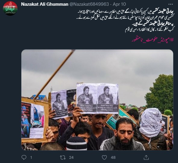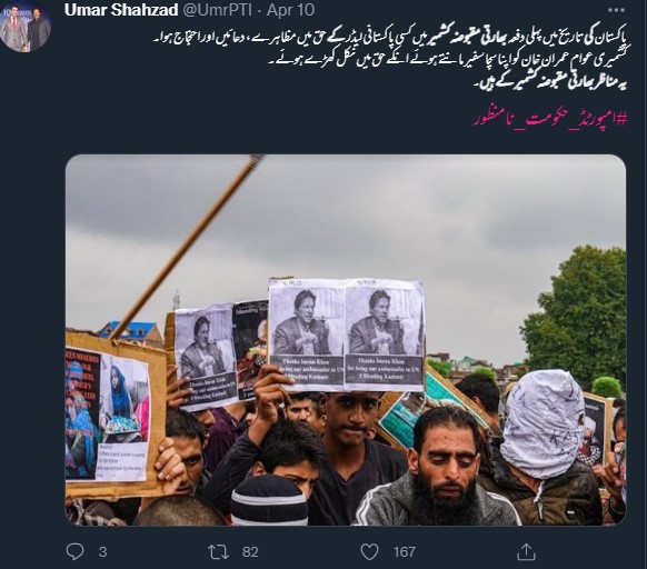 دیگر ٹویٹر صارفین نے تصویر کے کیپشن میں لکھا ہے کہ “پاکستان کی تاریخ میں پہلی دفعہ جموں کشمیر میں کسی پاکستانی لیڈر کے حق میں مظاہرے، دعائیں اور احتجاج ہوا۔ کشمیری عوام عمران خان کو اپنا سچا سفیر مانتے ہوئے ان کے حق میں نکل کھڑے ہوئے۔ یہ مناظر جموں کشمیر کے ہیں۔#امپورٹڈ_حکومت_نامنظور“۔