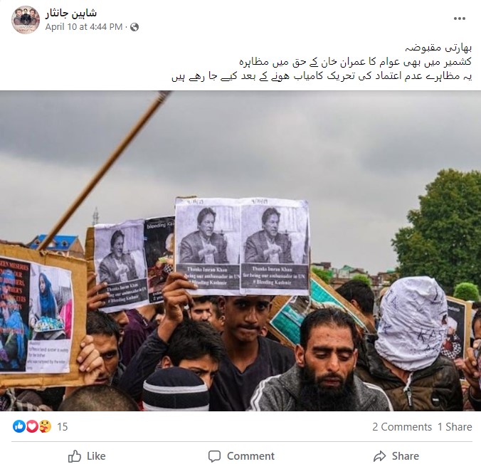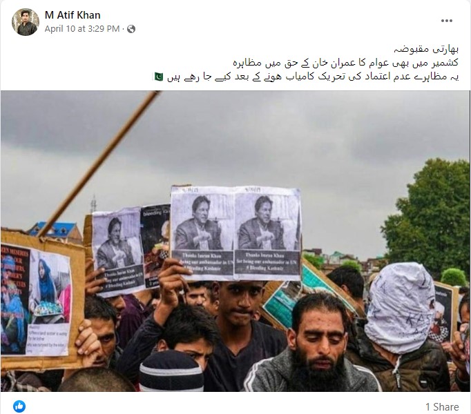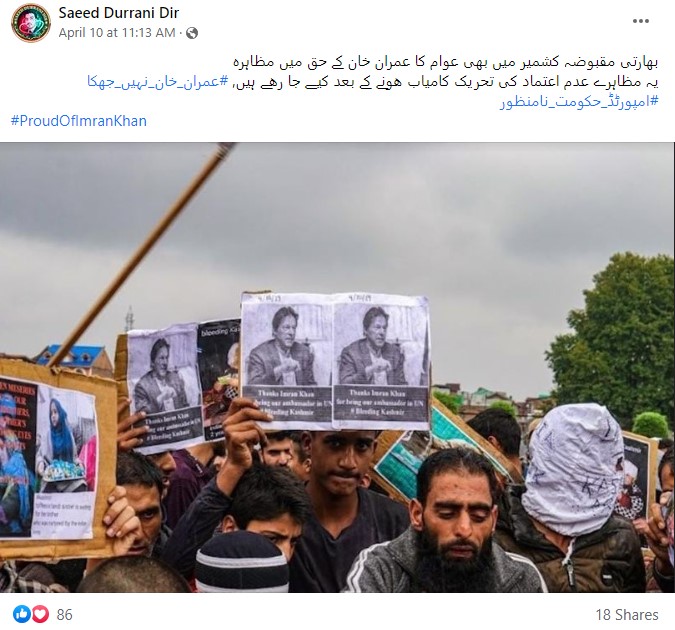 گزشتہ کئی دنوں سے پاکستان سیاسی بحران کا سامنا کر رہا ہے۔ پاکستان تحریک انصاف کی حکومت جانے کے بعد پاکستان کے سابق وزیر اعظم عمران خان کی حمایت میں لوگ احتجاج کر رہے ہیں۔ وہیں ان دنوں ایک تصویر وائرل ہو رہی ہے۔ تصویر سے متعلق صارف کا دعویٰ ہے کہ “جموں کشمیر کی عوام عمران خان کے حق میں مظاہرے کر رہی ہے، یہ مظاہرے کی تصویر پاکستان میں عدم اعتماد کی تحریک کامیاب ہونے کے بعد کی ہے”۔
