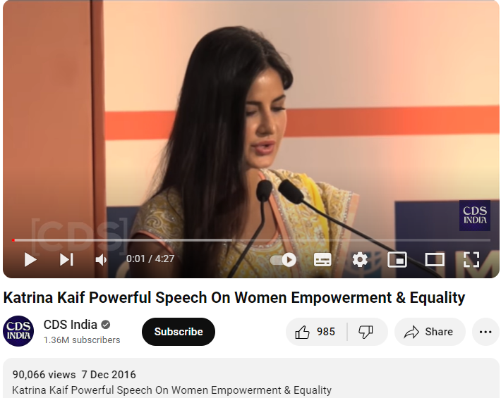 کترینہ کیف کا مذہب اسلام میں داخل ہونے کا بتاکر شیئر کی گئی ویڈیو کے ایک فریم کو ہم نے گوگل لینس پر سرچ کیا۔ جہاں ہمیں 7 دسمبر 2016 کو بی 4 یو انٹرٹینمنٹ اور سی ڈی ایس انڈیا نامی یوٹیوب چینل پر اپلوڈ شدہ ہوبہو ویڈیو ملی۔ لیکن اس ویڈیو میں کترینہ انگلش میں خطاب کرتی ہوئی سنائی دے رہی ہیں۔ ویڈیو کے ساتھ دی گئی معلومات کے مطابق کترینہ کیف کی یہ ویڈیو صنفی مساوات اور خواتین کے خلاف تشدد پر متاثر کن تقریر کی ہے۔