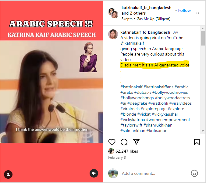 اس کے علاوہ ہمیں کترینہ کی عربی تقریر والی ویڈیو ‘کترینہ کیف ایف سی بنگلہ دیش‘ نامی انسٹاگرام پر ملی۔ جس میں اس ویڈیو کو اے آئی کی مدد سے تیار کردہ بتایا گیا ہے۔