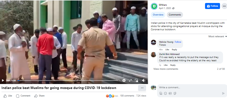 پولس کی جانب سے نمازیوں پر لاٹھی چارج والی ویڈیو کے ایک فریم کو ہم نے کچھ کیورڈ کے ساتھ گوگل ریورس امیج سرچ کیا۔ جہاں ہمیں 5 پیلرس نامی فیس بک پیج پر 1 اپریل 2020 کو شیئر شدہ ہوبہو ویڈیو ملی۔ جس میں اس ویڈیو کے حوالے سے لکھا گیا ہے کہ یہ کرناٹک میں کورونا وائرس لاک ڈاؤن کے دوران مسجد میں باجماعت نماز ادا کرنے کے لئے آئے لوگوں پر بھارتی پولس کی جانب سے کئے گئے لاٹھی چارج کی ہے۔