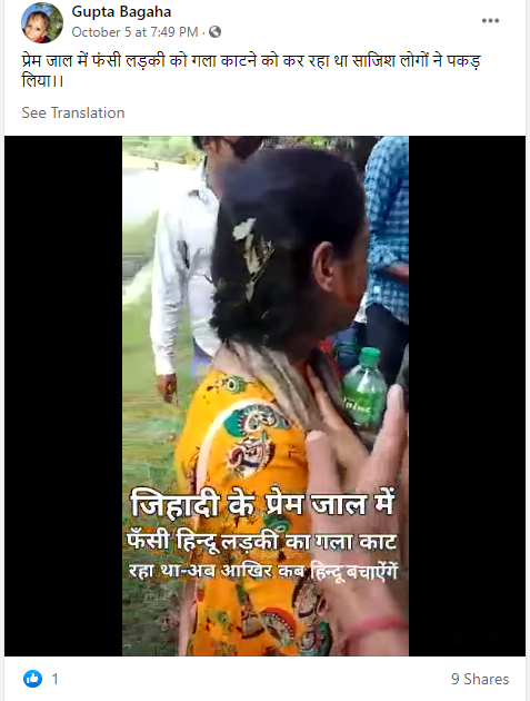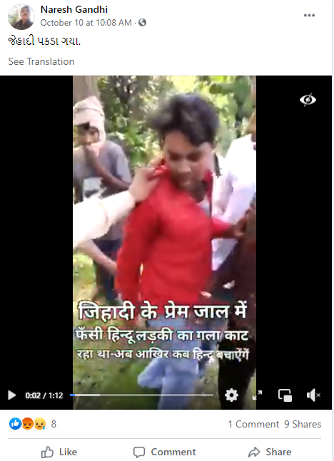 فیس بک پر ہندہ اور گجراتی کیپشن کے ساتھ ایک ویڈیو لو جہاد کا بتاکر شیئر کیا جا رہا ہے۔ جس میں کچھ لوگ ایک شخص کو لات گھوسوں سے مار پیٹ رہے ہیں۔ صارفین نے اس ویڈیو کے ساتھ کیپشن میں لکھا ہے کہ یہ لڑکا پریم جال میں پھنسی ہندو لڑکی کا گلا کاٹنے کی سازش کر رہا تھا۔ لیکن موقع پر ہندؤں نے بچا لیا۔
