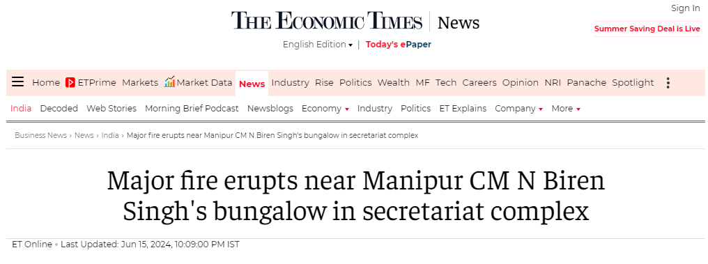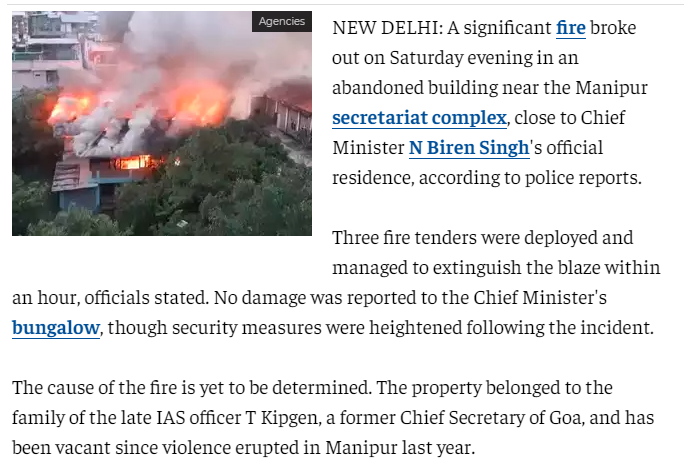 مزید تحقیقات کے دوران ہمیں پولس رپورٹ کے حوالے سے متعدد میڈیا رپورٹس موصول ہوئی۔ رواں ماہ کی 15 تاریخ کو شائع ہونے والی ایکنامک ٹائمس کی ایک رپورٹ میں واضح کیا گیا ہے کہ منی پور کے وزیر اعلیٰ این بیرن سنگھ کے بنگلا کے قریب موجود گووا کے سابق چیف سیکریٹری و مرحوم آئی اے افسر ٹی کیپگن کی عمارت میں بھیانک آگ لگ گئی ہے۔ اس واقعے میں کسی بھی طرح کا جانی نقصان نہیں ہوا ہے۔ بنگلہ منی پور میں گزشتہ ایک سال سے چل رہے فسادات کی وجہ سے بند تھا۔ البتہ اس حادثے کے بعد وزیر اعلیٰ بیرین سنگھ کی سرکاری رہائش گاہ کی سیکورٹی میں اضافہ کردیا گیا ہے۔
