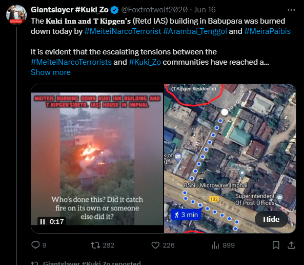 منی پور کے وزیر اعلیٰ بیرین سنگھ کی رہائش گاہ میں آگ لگائے جانے کا بتاکر شیئر کی گئی ویڈیو کے ایک فریم کو ہم نے گوگل ریورس امیج سرچ کیا۔ جہاں ہمیں گی آنٹ سلیئر کوکی-زو نامی ہینڈل کی جانب سے ہوبہو ویڈیو کے ساتھ ایک نقشے کی شیئر شدہ تصویر موصول ہوئی۔ جس کے ساتھ دی گئی معلومات کے مطابق ویڈیو میں نظر آرہی عمارت، جس میں آگ لگی ہوئی ہے، ریٹائرڈ آئی اے ایس افسر ٹی کیپگن کی ہے۔ یہ عمارت منی پور کے بابوپورا میں موجود ہے۔