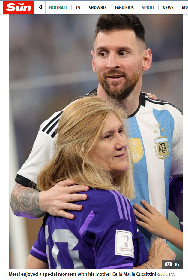 میسی کو گلے لگاتے ہوئے خاتون والی وائرل ویڈیو سے متعلق ہم نے انگلش میں “سیلیا ماریا کوکیٹینی” اور “ورلڈ کپ 2022” کیورڈ سرچ کیا۔ جہاں ہمیں 18 دسمبر 2022 کو شائع شدہ دی سن کی ایک رپورٹ ملی۔ جس میں ارجنٹینا کے فٹبالر میسی اور ایک بزرگ خاتون کی تصویر تھی۔ جس کے کیپشن میں لکھا تھا کہ “میسی اپنی والدہ سیلیا ماریا کوکیٹینی کے ساتھ ایک خاص لمحے سے لطف اندوز ہوتے ہوئے”۔