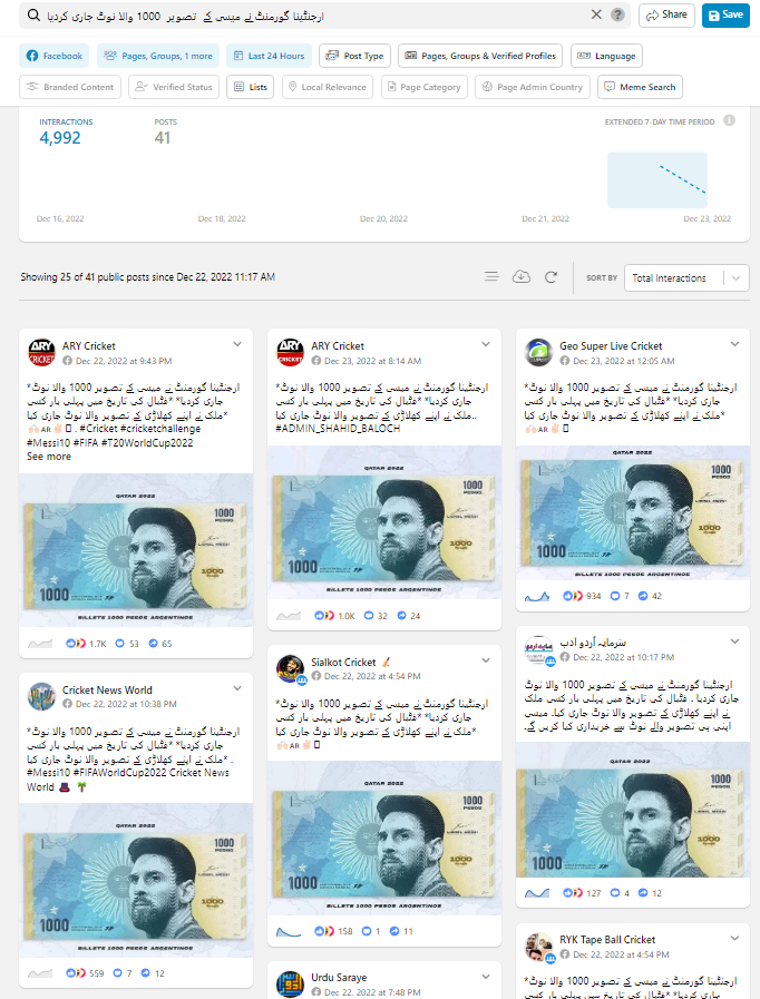 فیس بک پر مذکورہ نوٹ کی تصویر کو ارجنٹینا حکومت کی جانب سے 1000 کے نوٹ پر میسی کی تصویر جاری کرنے کا بتاکر کتنے صارفین نے شیئر کیا ہے؟ یہ جاننے کے لئے ہم نے کراؤڈ ٹینگل پر “ارجنٹینا گورمنٹ نے میسی کے تصویر 1000 والا نوٹ جاری کردیا” کیورڈ سرچ کیا تو ہمیں پتا چلا کہ اس موضوع پر پچھلے24 گھنٹوں میں 41 پوسٹ شیئر کئے گئے ہیں اور 4,992 فیس بک صارفین نے اس موضوع پر تبادلہ خیال کیا ہے۔ جبکہ متعدد ٹویٹر صارفین نے بھی مذکورہ دعوے کے ساتھ میسی کی تصویر لگے 1000 کا نوٹ شیئر کیا ہے۔