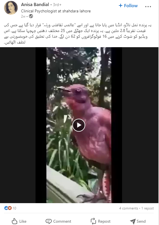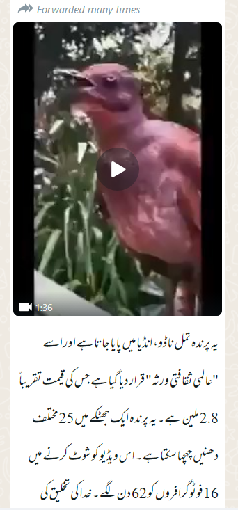 فیس بک، ٹویٹر، یوٹیوب، لنکڈن اور واہٹس ایپ پر ان دنوں ایک پرندے کی ویڈیو خوب وائرل ہو رہی ہے، جس میں پرندہ بیک وقت مختلف آوازیں نکالتا ہوا نظر آرہا ہے۔ دعویٰ کیا جا رہا ہے کہ یہ بھارت کے تمل ناڈو میں پایا جانے والا پرندہ ہے جو 25 مختلف دھنیں چہچہا سکتا ہے۔ اس ویڈیو کو 62 دنوں میں 16 فوٹوگرافروں نے شوٹ کیا ہے۔ اس پرندے کو عالمی ثقافتی ورثہ قرار دیا گیا ہے اور اس کی قیمت تقریباً 2.8 ملین ہے۔