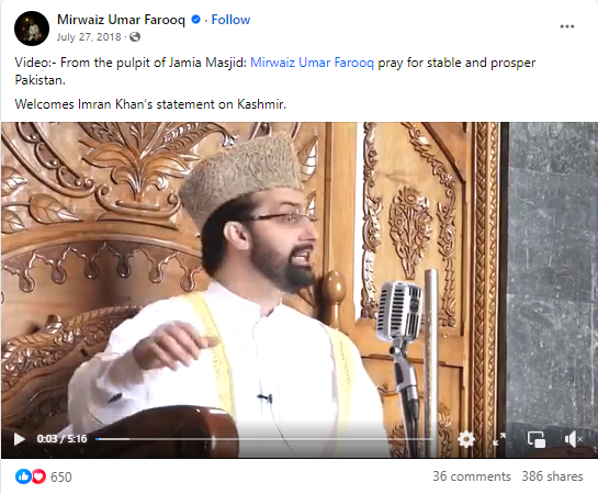 ہم نے سب سے پہلے میر واعظ عمر فاروق کے آفیشل فیس بک پیج کو کھنگالا تو ہمیں 27 جولائی 2018 کو شیئر شدہ ہوبہو ویڈیو ملی۔ جس کے ابتدائی 30 سیکینڈ میں وہ یہ کہتے ہوئے سنائی دے رہے ہیں کہ “پاکستان میں الیکشن اختتام پذیر ہوئے، نئی حکومت بننے جا رہی ہے اور ہماری یہ دعاء ہے کہ پاکستان میں ایک مضبوط اور مستحکم حکومت قائم ہو اور لگ رہا ہے کہ اس بار عمران خان کی پارٹی پاکستان تحریک انصاف حکومت بنائے گی اور کل(27 جولائی 2018) جو ان کا بیان آیا خاص کر کشمیر کے حوالے سے ہم اس کا استقبال کرتے ہیں”۔