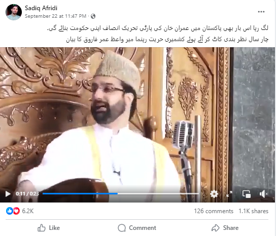 اب اسی واقعے سے منسوب کرکے کے کئی ویریفائڈ ہینڈلس سے سوشل میڈیا صارفین حریت رہنما میر واعظ عمر فاروق کی 23 سیکینڈ کی ایک کلپ شیئر کر رہے ہیں۔ جس میں عمر فاروق یہ کہتے ہوئے سنائی دے رہے ہیں کہ “ایک نئی حکومت بننے جا رہی ہے اور ہماری یہ دعاء ہے کہ پاکستان میں ایک مضبوط اور مستحکم حکومت قائم ہو اور لگ رہا ہے کہ اس بار عمران خان کی پارٹی پاکستان تحریک انصاف حکومت بنائے گی”۔