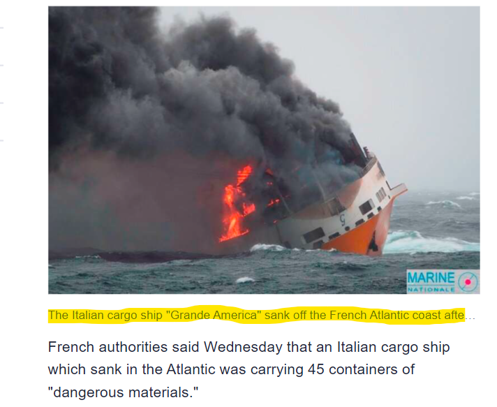 تصویر فرانس کے ساحل پر 2019 میں خطرناک مواد سے لدے کارگو جہاز کے ڈوبنے کی ہے۔