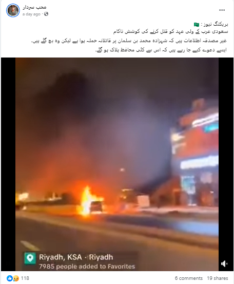 فیس بک، ایکس اور یوٹیوب پر ایک ویڈیو شیئر کی جا رہی ہے۔ جس میں سڑک پر آگ میں لپٹی گاڑیاں نظر آرہی ہیں، سڑک پر ارد گرد پولس کی گاڑیوں کو بھی دیکھا جا سکتا ہے۔ صارفین کا دعویٰ ہے کہ یہ ویڈیو سعودی عرب کے ولی عہد محمد بن سلمان پر قاتلانہ حملے کی ہے۔