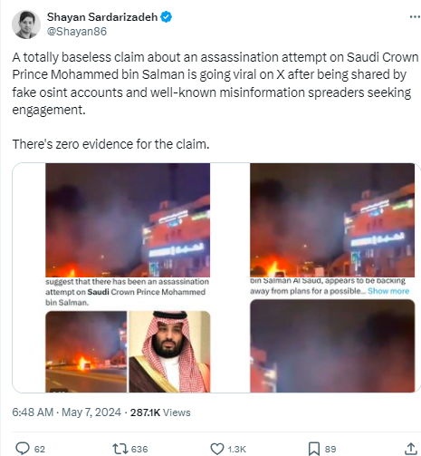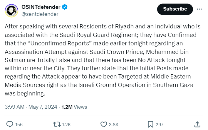 ہم نے سب سے پہلے گوگل پر “سعودی عرب محمد بن سلمان آن اٹیک” کیورڈ سرچ کیا۔ جہاں ہمیں اوپن سورس انٹیلی جنس میں مہارت رکھنے والی تنظیم کے آفیشل ایکس ہینڈل ‘اوسینٹ ڈیفینڈر’ پر 7 مئی 2024 کا ایک پوسٹ فراہم ہوا۔ جس میں ریاض کے رہائیشیوں اور سعودی رائل گارڈ سے وابستہ ایک شخص سے تصدیق کے بعد واضح کیا گیا ہے کہ سعودی ولی عہد محمد بن سلمان پر حالیہ دنوں میں ہوئے قاتلانہ حملے کی خبر پوری طور سے غیر مصدقہ ہے۔